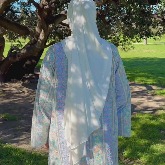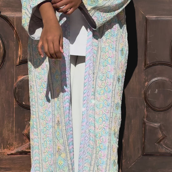 Découvrez notre kimono long entièrement orné de strass, une pièce d’exception confectionnée dans un tissu traditionnel travaillé à la main à Dubaï. Chaque détail reflète un savoir-faire minutieux, offrant un rendu luxueux et raffiné qui attire délicatement la lumière.